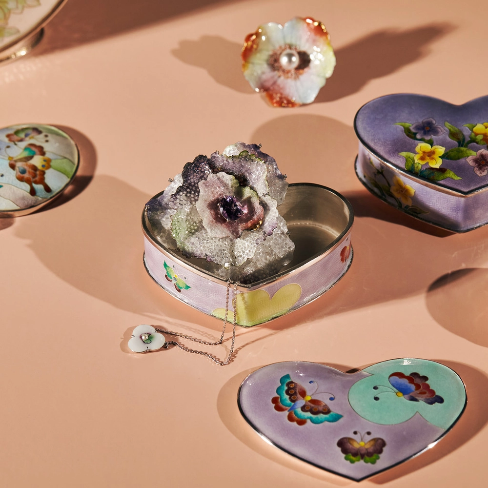 채율의 도라지꽃 은칠보 하트함은 변치 않는 사랑을 상징하는 하트 형태와 '영원한 사랑'이라는 도라지꽃의 꽃말이 만나 사랑의 결실을 시각적으로 구현한 작품입니다. 순은 위에 채율만의 정교한 칠보 기법으로 장식되어 은은하면서도 화려한 아름다움을 전합니다. 소중한 보석이나 기념물을 보관하기에 좋으며, 진심을 전하는 격조 있는 선물로도 손색 없는 작품입니다.