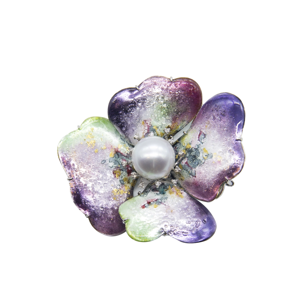 At the heart of the blossom, an elegantly lustrous pearl is placed, providing a soft and sophisticated sense of balance. With its refined four-petal form and vibrant hues, this piece adds a prestigious touch to both formal attire and daily styling, serving as a highly collectible, artistic lifestyle objet.